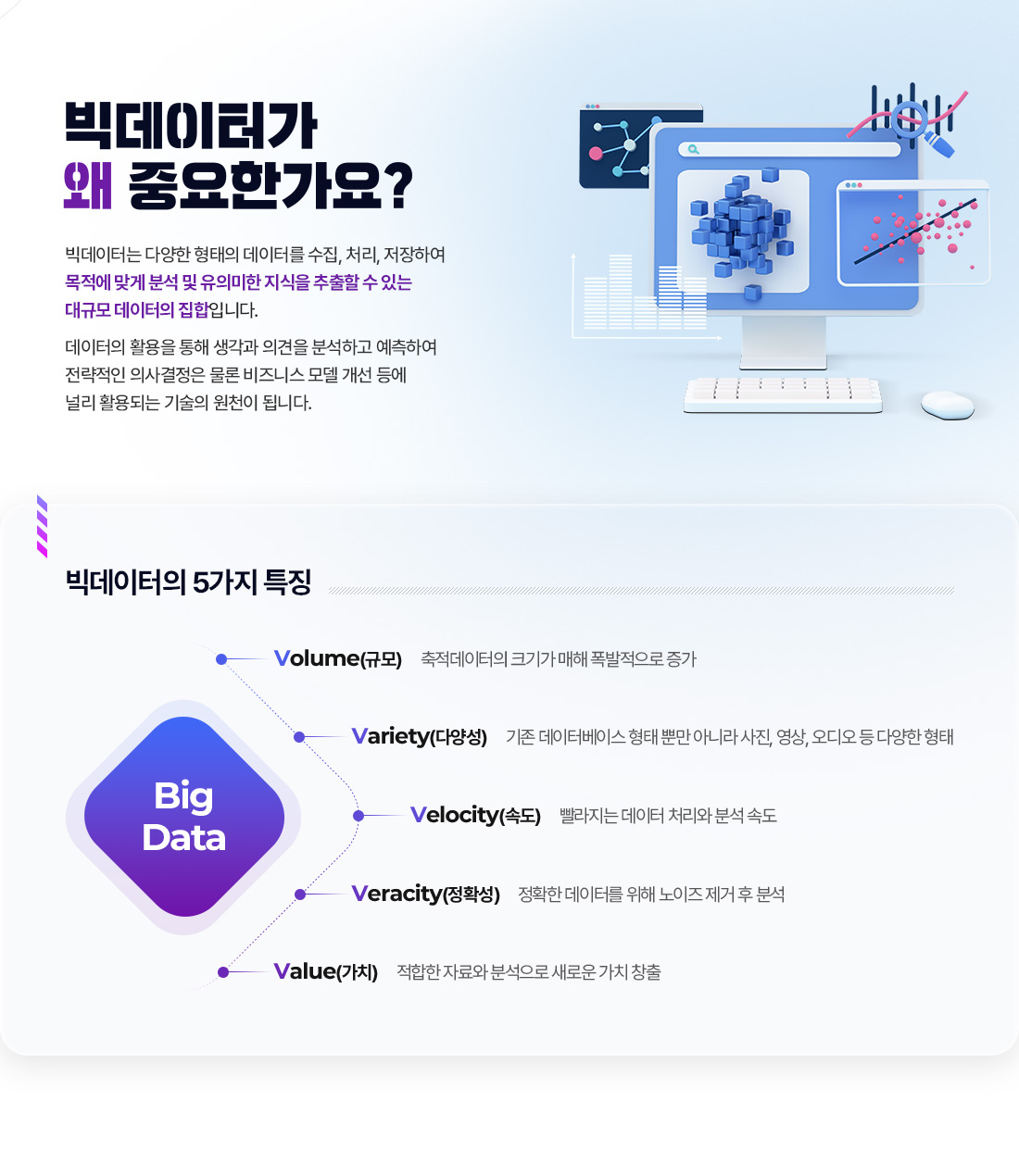 빅데이터는 다양한 형태의 데이터를 수집, 처리, 저장하여 목적에 맞게 분석 및 유의미한 지식을 추출할 수 있는 대규모 데이터의 집합입니다.